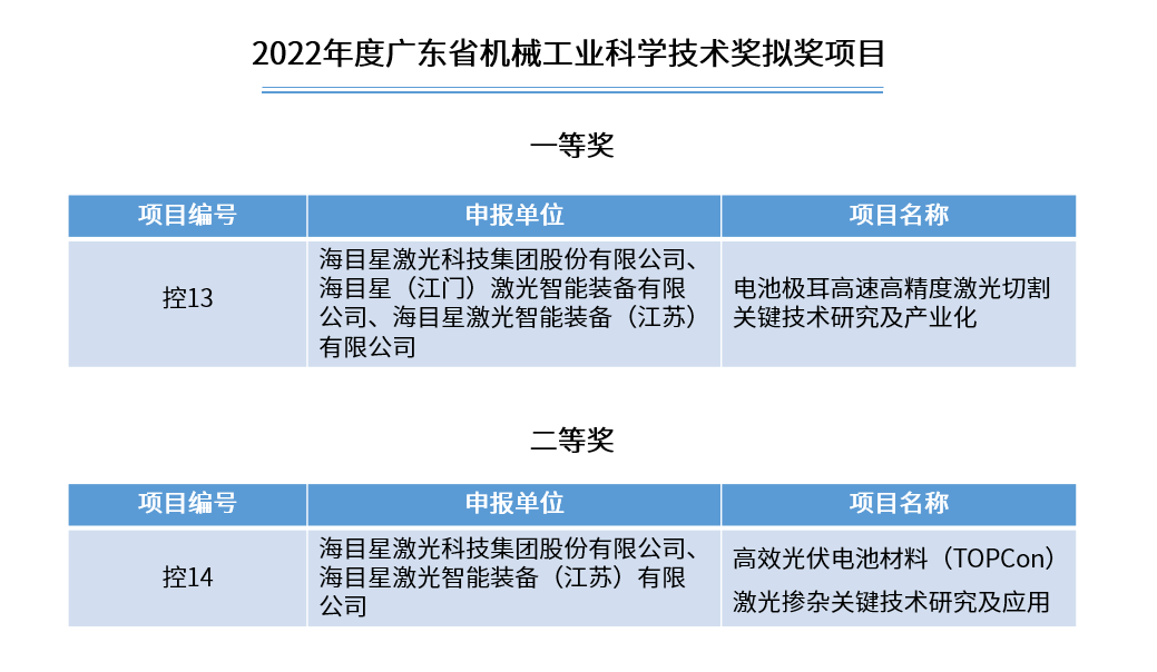 近日,廣東省機(jī)械工程學(xué)會(huì)通過(guò)官方渠道公示2022年度廣東省機(jī)械工業(yè)科學(xué)技術(shù)獎(jiǎng)獲獎(jiǎng)項(xiàng)目,海目星申報(bào)的《電池極耳高速高精度切割關(guān)鍵技術(shù)研究及產(chǎn)業(yè)化》《高效光伏電池材料(TOPCon)激光摻雜關(guān)鍵技術(shù)研究及應(yīng)用》項(xiàng)目分獲科學(xué)技術(shù)獎(jiǎng)一、二等獎(jiǎng)。