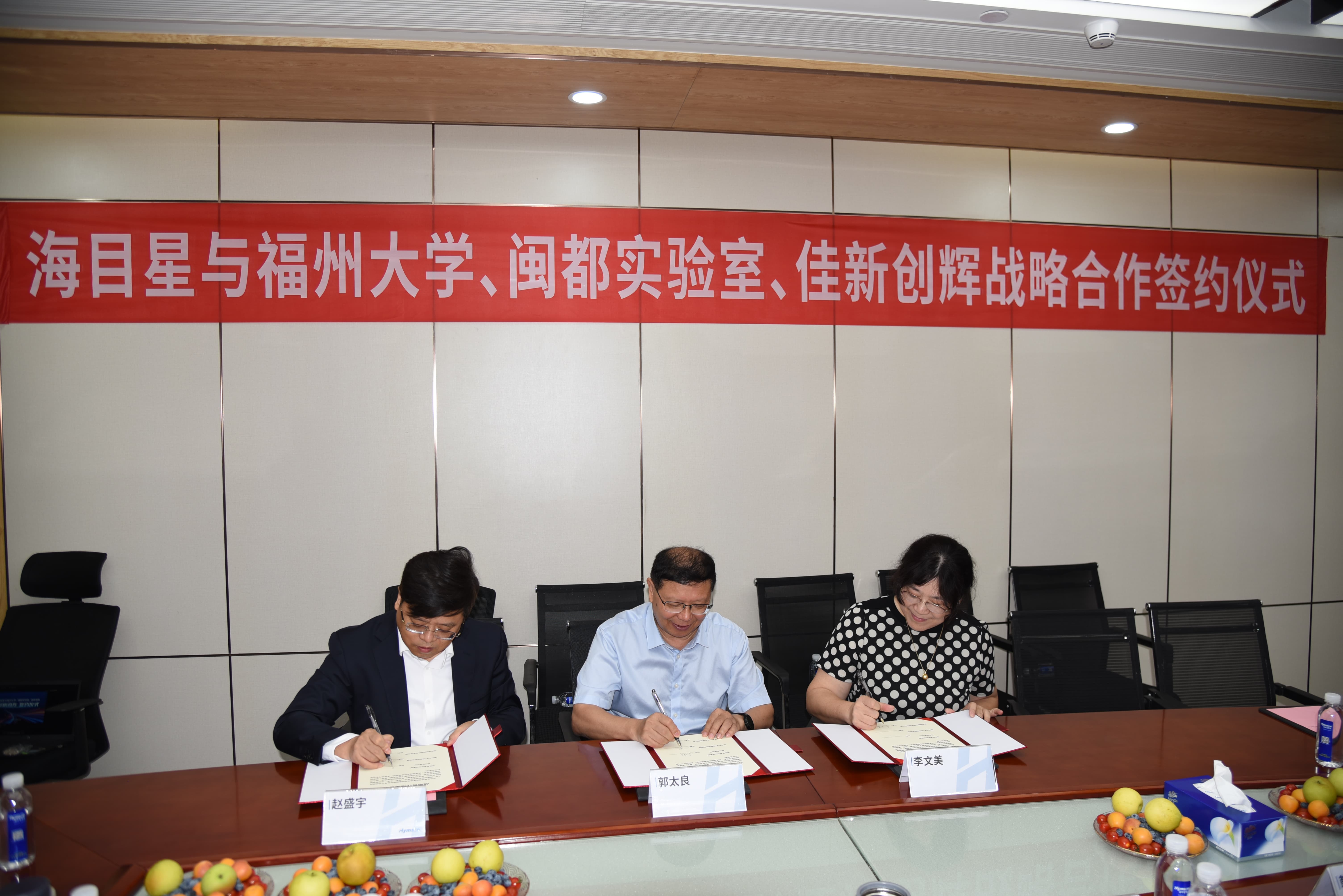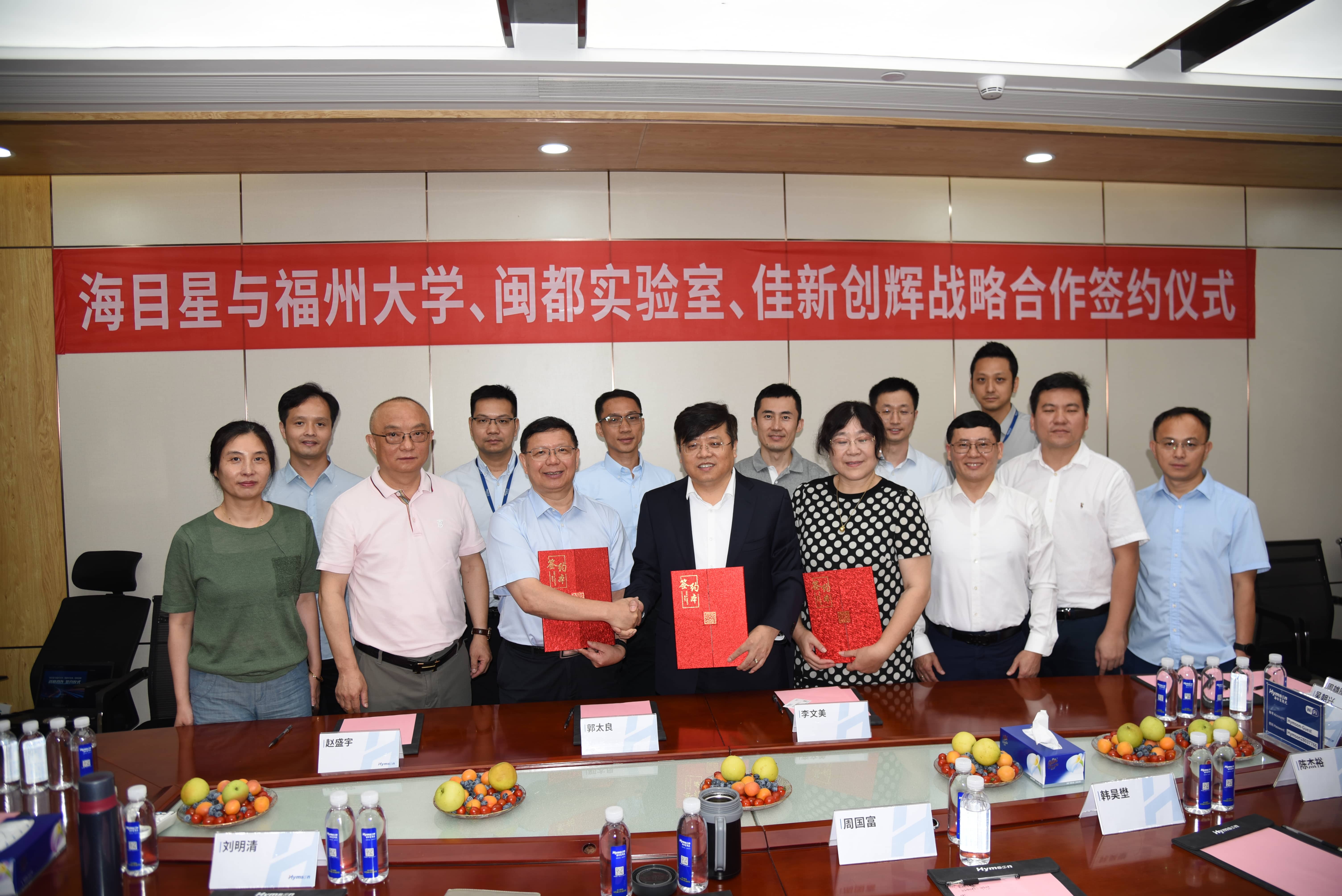 簽約現(xiàn)場(chǎng),海目星董事長趙盛宇與福州大學(xué)、閩都實(shí)驗(yàn)室代表郭太良教授,佳新創(chuàng)輝董事長李文美分別作為四方代表,共同簽署戰(zhàn)略合作協(xié)議。海目星董事、首席科學(xué)家周國富教授,海目星副總經(jīng)理、首席人力戰(zhàn)略官韓昊壄,海目星3C行業(yè)中心總經(jīng)理劉明清,海目星3C行業(yè)中心新產(chǎn)品孵化部副總經(jīng)理梁祖薪,以及福州大學(xué)吳朝興教授等一行代表受邀出席并見證簽約。