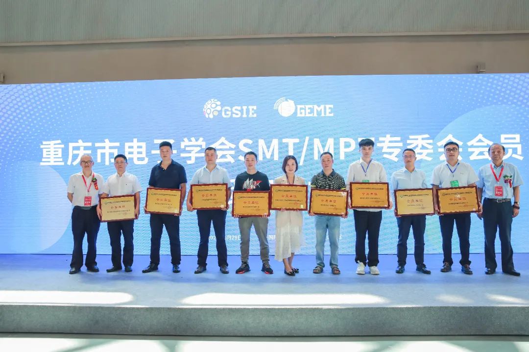 本屆博覽會同期舉辦了“GEME 2022電子產業鏈創新發展大會”,匯聚智造精英,共同為電子產業熱點話題展開交流。會上,重慶市電子學會表面貼裝與微組裝技術委員會為深圳市海目星激光智能裝備股份有限公司授會員單位牌匾。